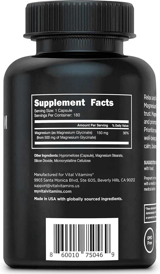 Vital Vitamins Magnesium Glycinate 500mg - High Absorption Formula - Promotes Relaxation, Calmness, & Restful Sleep - Pure Magnesium Supplement for Men & Women - 180 Capsules, Vegan, Non-GMO