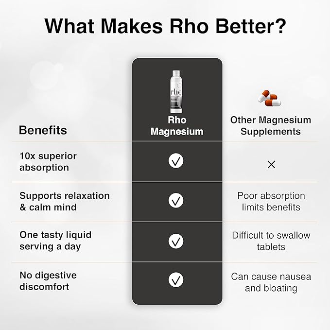 - 10X BETTER ABSORPTION: Liposomal technology encapsulates tiny pouches similar to cell membranes, increasing bioavailability and absorption by up to 10X. Rho bypasses the digestive system, ensuring superior absorption over traditional capsule, pill, and powder Magnesium supplements prone to causing digestive issues and discomfort.