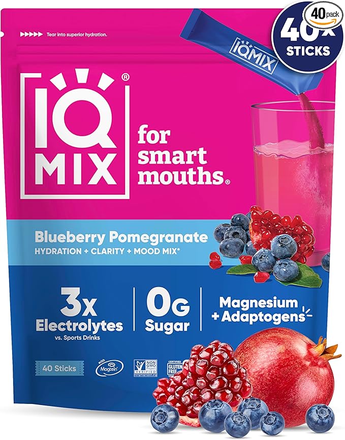 IQMIX Hydration Electrolyte Powder – 4-in-1 Formula for Hydration, Mental Clarity, Mood and Recovery – Sugar-Free Drink Mix, Keto, Magnesium L-Threonate, Lion’s Mane – 40 Count Blueberry Pomegranate