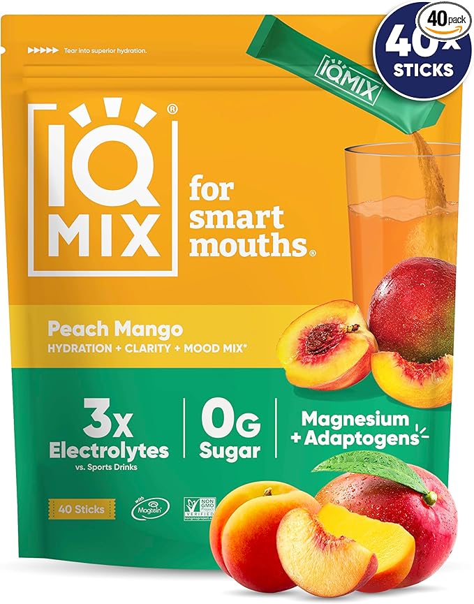 IQMIX Hydration Electrolyte Powder – 4-in-1 Formula for Hydration, Mental Clarity, Mood and Recovery – Sugar-Free Drink Mix, Keto, Magnesium L-Threonate, Lion’s Mane – 40 Count Peach Mango