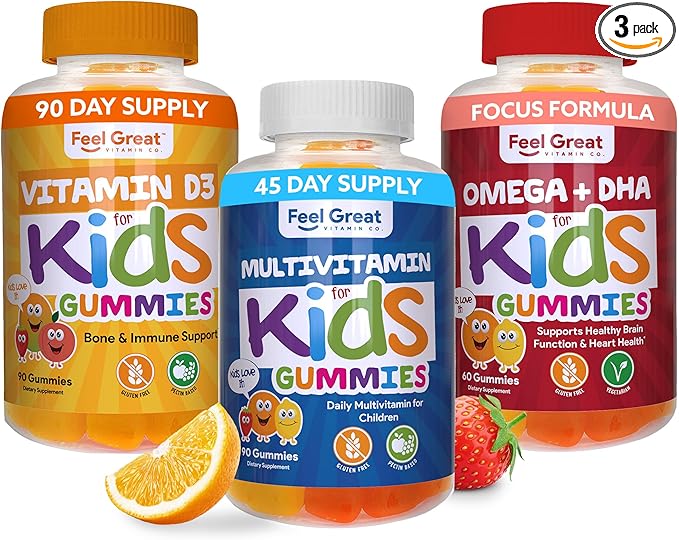 Feel Great Kids Essentail Vitamins Trio - Omega + DHA - Vitamin D - Multivitamin for Wellness & Immune Support
