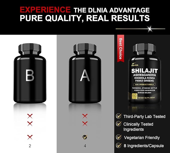 - 💪SATISFACTION GUARANTEE WITH EVERY CAPSULE: Harvested from the ancient Himalayas & meticulously blended with 7 potent, natural ingredients, our DLNIA 8-in-1 Shilajit Supplement is proudly formulated, tested, & certified here in the USA; we hold our product to the highest standards of quality, & efficacy; Your Health & satisfaction are our priorities, so rest assured that our shilajit premium capsules are free from impurities & preservatives