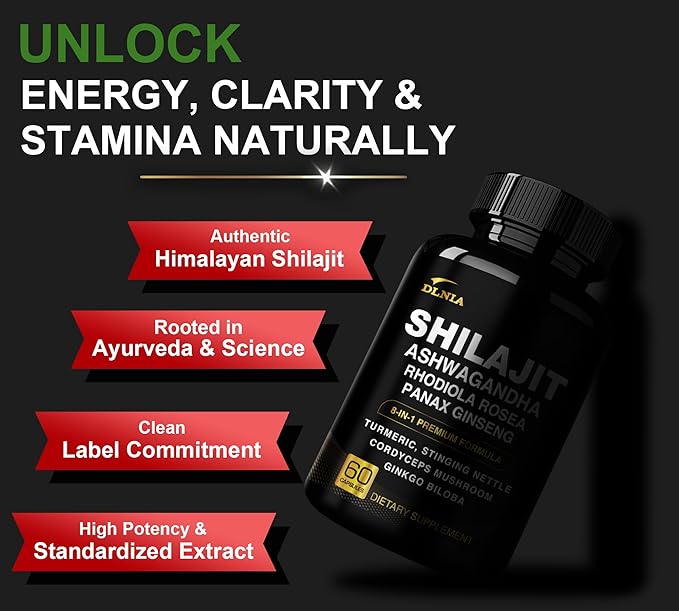 - 💪TRANQUIL NIGHTS & VIBRANT MORNINGS: Discover the secret to wakeful mornings & restorative sleep with DLNIA all-in-one supplement shilajit pure Himalayan organic capsules; The blend of Turmeric, Cordyceps Mushroom, Stinging Nettle with Himalaya Shilajit for women & men boost energy, improve immunity ; A single solution to all your supplement needs