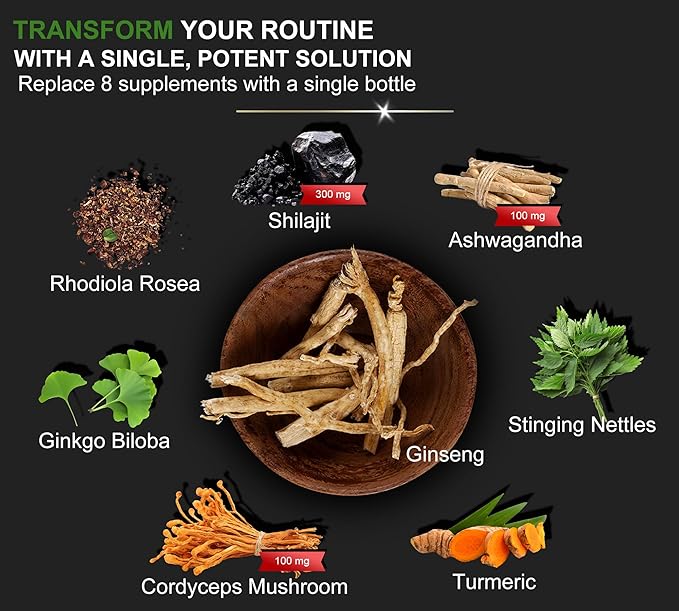 - 💪UNLOCK NATURE’S SECRET TO VITALITY: Experience an unparalleled boost in energy with our 8-in-1 Shilajit capsules for men & women; a curated blend of ancient Himalayan shilajit, Ginkgo Biloba, & Panax Ginseng stimulates your overall wellness, ensuring you power through your day with vigor & zest; The potent blend of Rhodiola rosea & Ashwagandha improves your overall wellness and cortisol management.