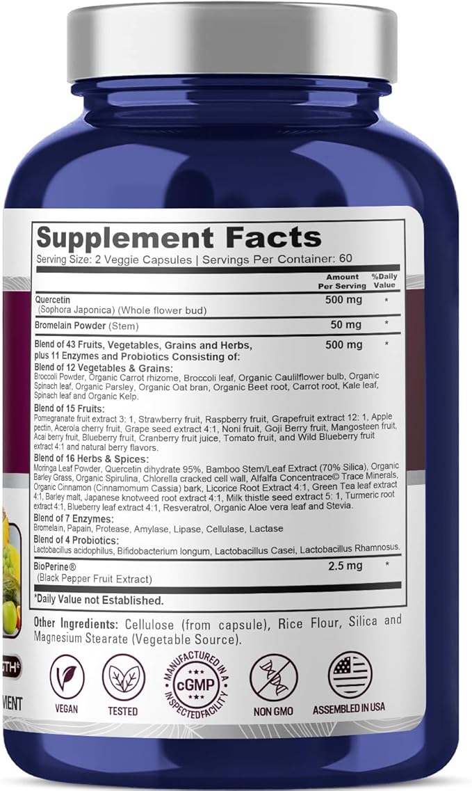 NusaPure Quercetin with Bromelain 500mg |120 Veggie Caps | 43 Fruit Veggie Grain Herbs Enzyme Probiotic Blend | Non-GMO, Vegan, Bioperine