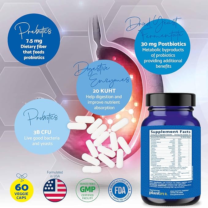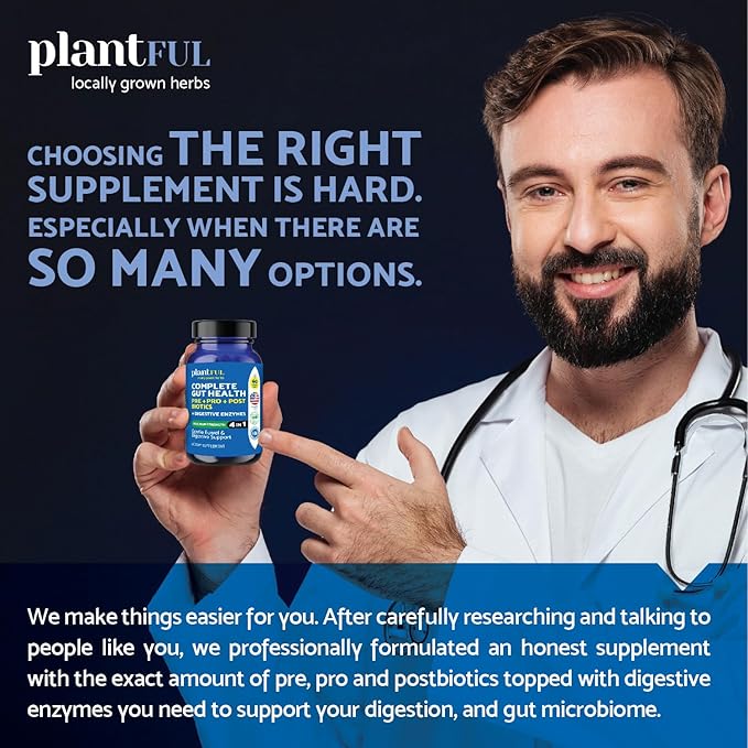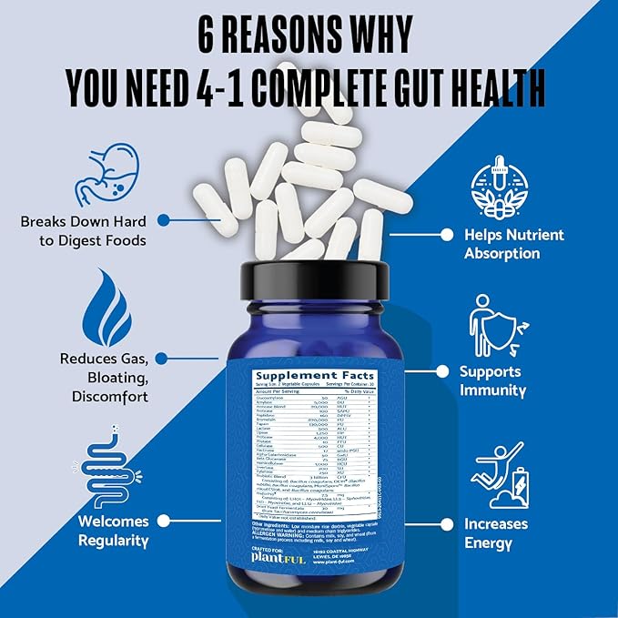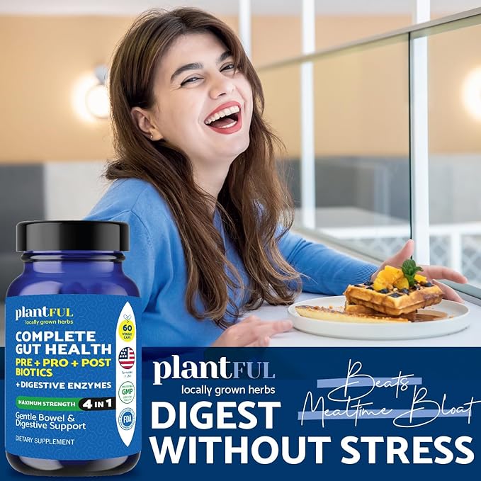 - COMPLETE GUT HEALTH & DIGESTIVE SUPPORT. Plantful Research 4-in-1 formula offers comprehensive support for your gut health, combining combines prebiotics, probiotics, and digestive enzymes to support digestion, improve nutrient absorption, and a balanced gut microbiome with 2 NON GMO vegetarian capsules/ day.