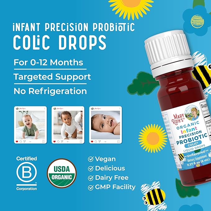 - For Most Lifestyles: MaryRuth's Organic Infant Precision Probiotic Colic Liquid Drops are Certified USDA Organic, Vegan, Non-GMO. Dairy Free, Nut Free, Gluten Free, Soy Free, Sugar Free. Made in a GMP Facility. Clean Label Project Verified. B Corp Certified.