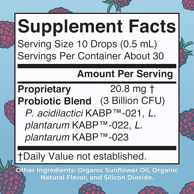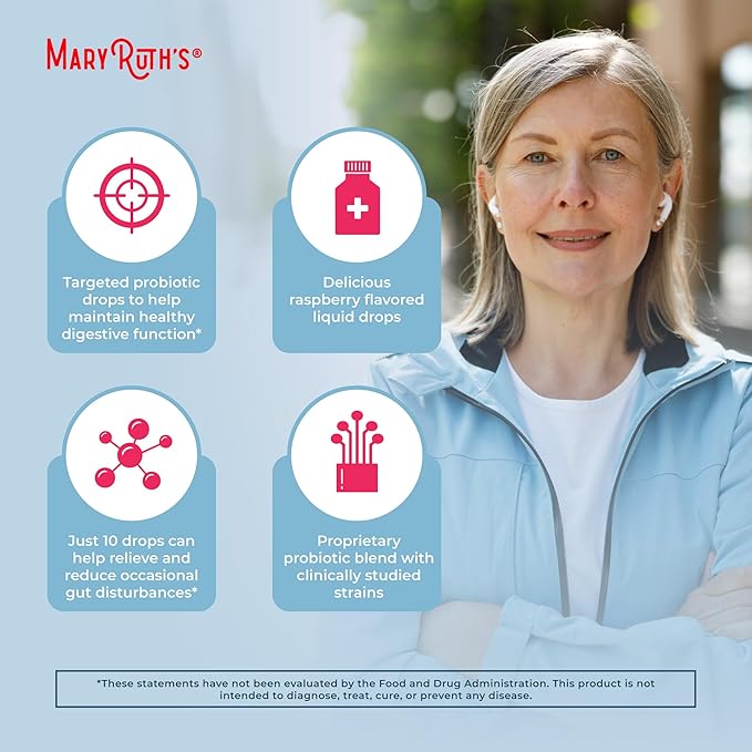 - Mary Ruth Probiotic Liquid Drops: Enjoy our proprietary probiotic blend with clinically studied strains P. acidilactici KABP-021, L. plantarum KABP-022, and L. plantarum KABP-023. Support your overall health and wellness by incorporating these delicious raspberry-flavored drops into your daily routine.