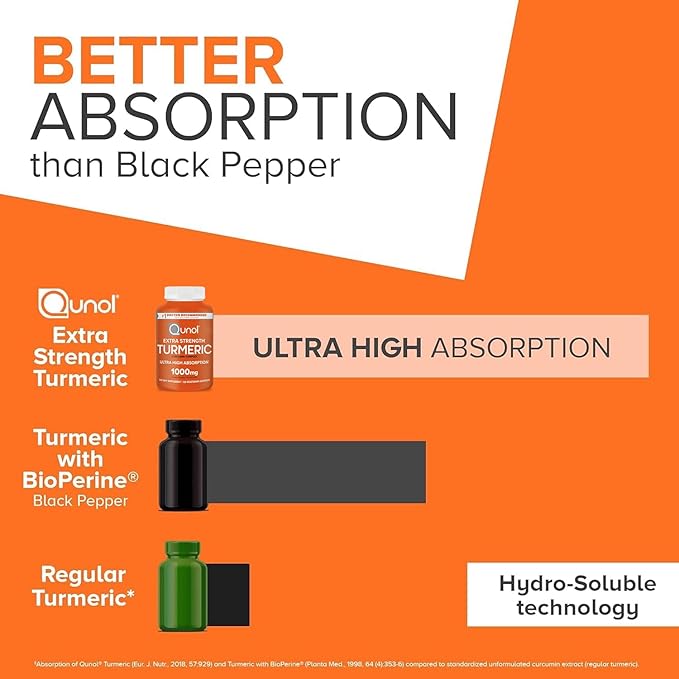 - 40X BETTER ABSORPTION: Qunol Extra Strength Turmeric Curcumin complex has a patented hydro-soluble technology delivering Ultra High Absorption when compared to regular turmeric which doesn't dissolve in water, dissolves poorly in fat, and absorbs poorly
