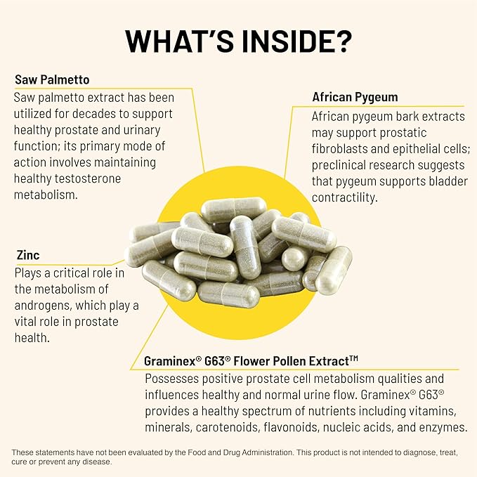- QUALITY INGREDIENTS: This prostate support supplement contains key inredients such as African Pygeum, Graminex G63 Flower Pollen Extract, Lycopene, Pumpkin Seed Extract, Green Tea, Zinc, & Magnesium
