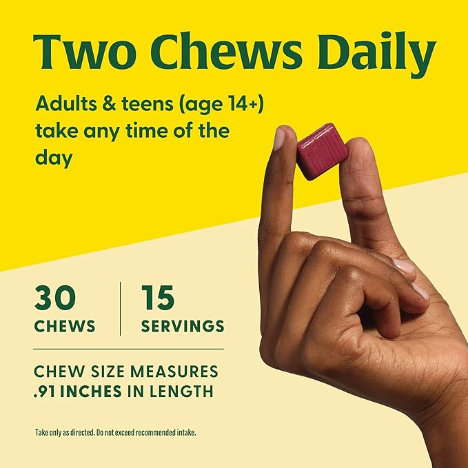 - TASTY STRAWBERRY SOFT CHEWS: Adults take two soft chews daily any time throughout the day; Individually wrapped, so you can conveniently carry your chews on-the-go; 3 g of sugar per 2 chew serving