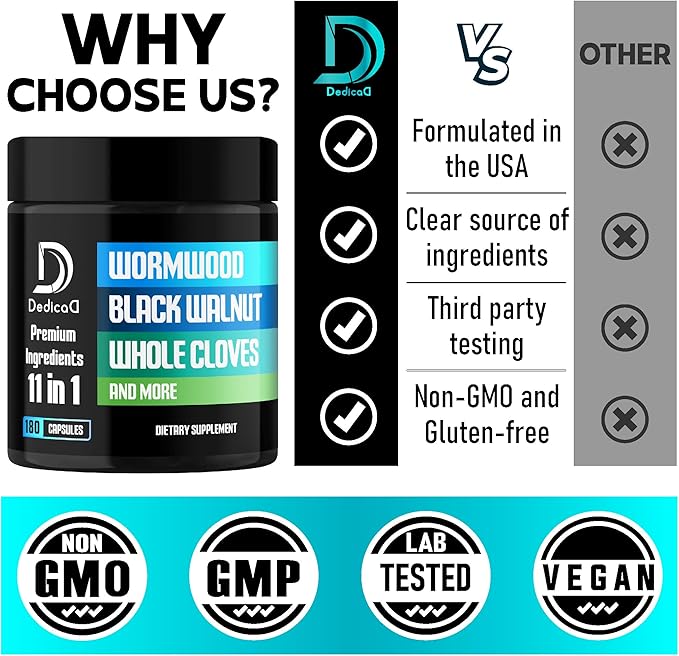- 💚 DedicaD Wormwood Capsules offer an impressive 1000mg of exceptional strength daily, providing an advanced blend for supporting a healthy lifestyle. Experience the remarkable benefits of our potent Wormwood Powder Extract without the need to consume a large quantity of Wormwood vegetables with an unpleasant odor that may be hard to swallow.