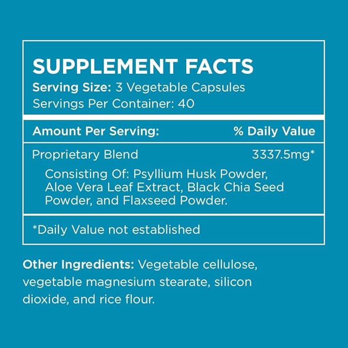 - ONE-OF-A-KIND CLEANLINESS SUPPLEMENT: What makes our Fiber extra strong? With 3,337.5mg per serving (1,112.5mg per capsule), our extra-large capsules contain more of our effective proprietary blend of ingredients. Made with more than just psyllium husk, our capsules contain premium-sourced Aloe Vera Leaf Extract, Chia Seeds, Flaxseed, and Psyllium Husk.