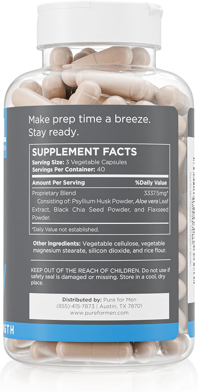 Pure for Men Stay Ready Fiber Extra Strength Supplement | Digestive Regularity | Bowel Movement & Gut Health Support | Vegan Cleanliness | Proprietary Formula | 120 Vegan XL Capsules