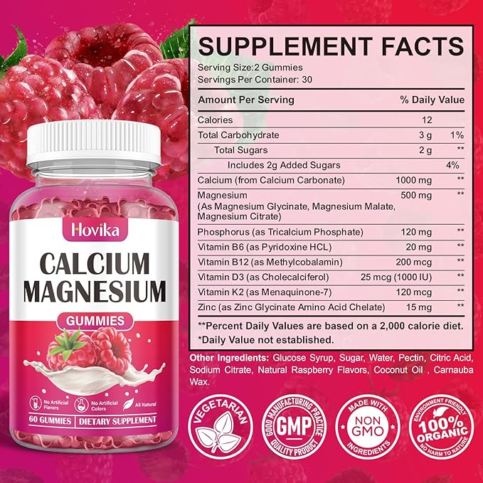 - Premium Ingredients - Hovika Calcium Magnesium Zinc Gummies are manufactured in accordance with highest standards. The calcium magnesium zinc d3 supplement is soy free, non-GMO, gluten-free and vegan-friendly. If you are not satisfied with our products for any reason, please feel free to contact us.*
