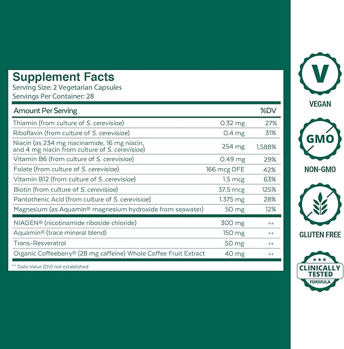 • GOLD-STANDARD INGREDIENTS: It’s true — Niagen boosts NAD+ levels. But it works even better with helper ingredients. Qualia NAD+ offers ultra bioavailable forms of trans-resveratrol, B- vitamin complex, and marine magnesium (from Aquamin) to help supercharge NAD+ metabolism. All ingredients are vegan, non-GMO, and gluten-free.