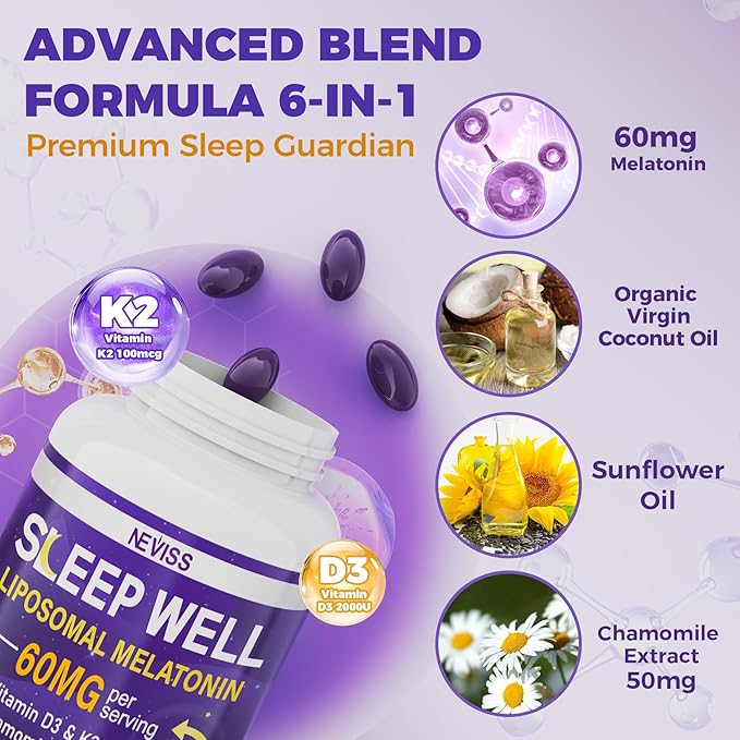 - 🌛Advanced Liposomal Melatonin for Optimal Zzz Support -- Enhance your rest quality with our advanced melatonin formula, featuring Liposomal Melatonin 60mg for optimal absorption. This innovative formula includes a liposomal matrix of Sunflower Oil and Organic Virgin Coconut Oil, ensuring that your body can effectively utilize melatonin for a restful night. Indulge in a restful night and wake up feeling refreshed and rejuvenated.