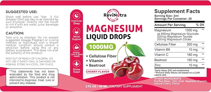 - PREMIUM MAGNESIUM LIQUID DROPS: Elevate your wellness routine with our potent triple magnesium supplement, featuring 600 mg magnesium glycinate, 200 mg magnesium taurate, and 200 mg magnesium citrate per serving. Our magnesium glycinate liquid drops are expertly crafted to improve sleep quality, support muscle & bone health, and promote nerve & calm mood, all while aiding in digestion. Ignite your journey to vibrant health and a balanced life with ReviNutra