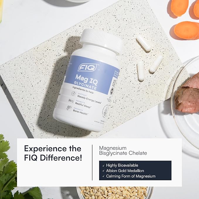 FIQ - Mag IQ Glycinate - Magnesium Bisglycinate Chelate TRAACS - High Absorption Magnesium Glycinate Supplement - Sleep, Daily Energy, & Bone Wellness - 60 Capsules