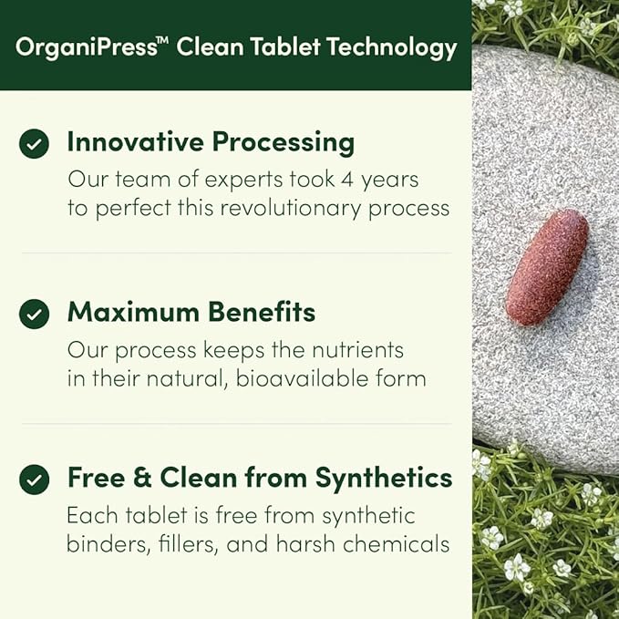 - Organic Food Bound Technology: Made with real food ingredients that carry and deliver vitamins and minerals in a highly bioavailable form; Clean Tablet Technology uses whole foods, minimizing inactive ingredients