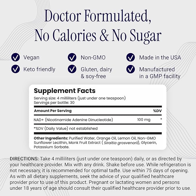 - CONVENIENT LIQUID FORM: Formulated in a liquid form with a light and fresh lemon-essence flavor, Rho Nutrition Liposomal NAD+ is vegan, sugar free, Keto, non-GMO, gluten, dairy & soy-free. Manufactured in the USA in a cGMP facility and third-party tested.