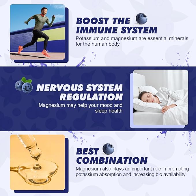 - NATURAL & VEGAN - For your health, all of the ingredients in our Blueberry Flavored Potassium Magnesium Drops are natural, non-GMO, gluten-free, no artificial additives, sugar-free, and vegan. Packaged in two bottles for added convenience and great value, care for your health anytime, anywhere.