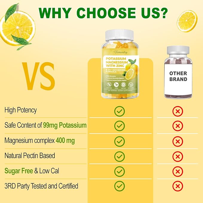 - 【Sugar-Free & Easy to Chew】 Our potassium magnesium gummies are SUGAR-FREE, and with a NATURAL LEMON FLAVOR, they are not only enjoyable to consume but also easy to digest. Crafted from high-quality pectin, they won't stick together and are gentle on the stomach, ensuring a pleasant chewing experience. With each bottle providing a 1-Month Supply, taking 2 gummies daily transforms your routine into a delightful ritual, making you eagerly anticipate the next one!