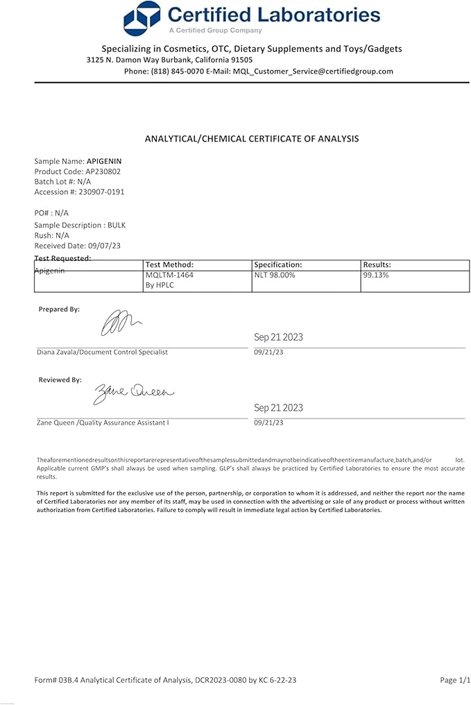 - Top-tier Quality - Vegan, non-GMO, and free of gluten, soy, and dairy, these apigenin capsules provide 120 servings of high-potency support without artificial additives.