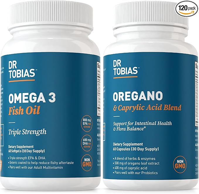 Dr. Tobias Omega 3 Fish Oil and Oregano & Caprylic Acid Supplements, Supports Heart, Brain, Immune with Gut Flora Balance Complex & Intestinal Health for Women & Men