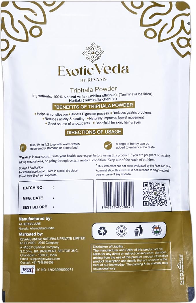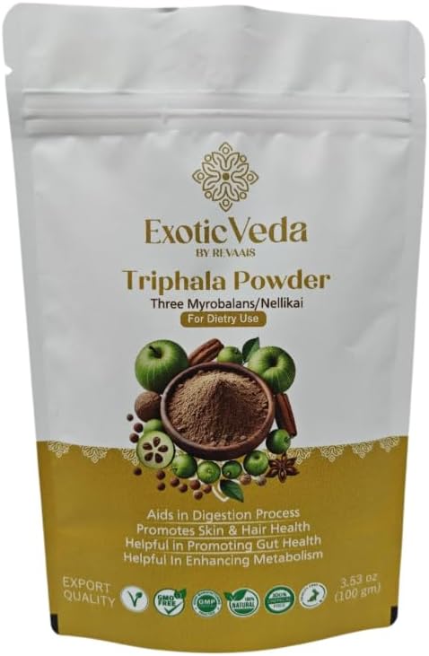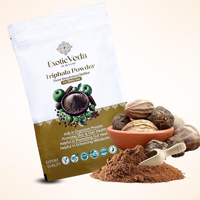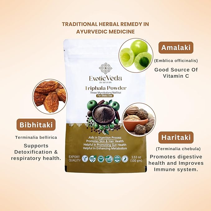 - PURE AND NATURAL FORMULATION: Our Exotic Veda Triphala churna is crafted entirely from naturally grown Ayurvedic herbs, free from chemicals, artificial additives, preservatives, sugar, and gluten. This straightforward, natural formulation makes it ideal for everyday use. Our Triphala powder is certified organic and gluten-free, guaranteeing the highest quality and safety.