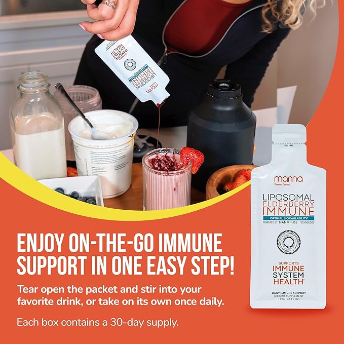 Manna Liposomal Elderberry Immune Packets – Vitamins C, D, Zinc, Echinacea & Ginger - Daily Immune Support for Adults & Kids - Sugar Free, Real Elderberry Extract & Syrup, Travel-Friendly, 30 Pack