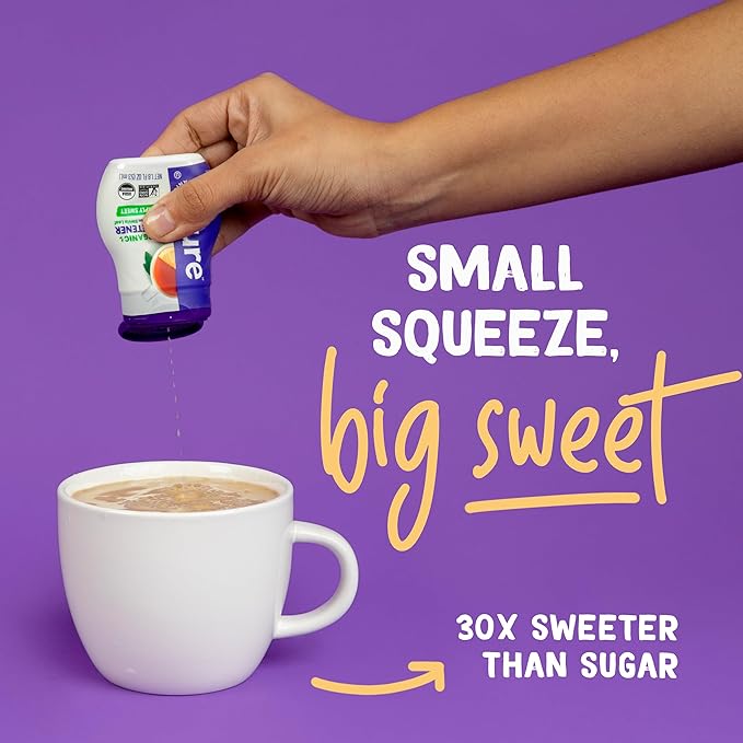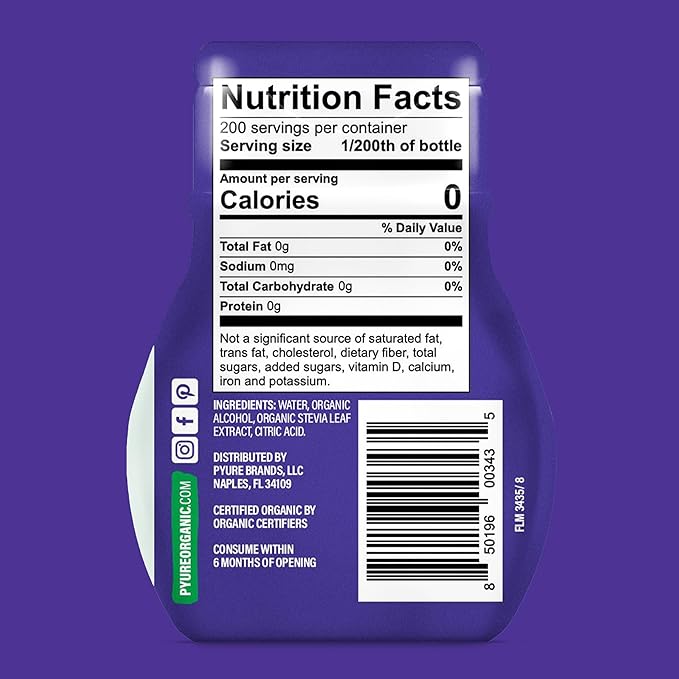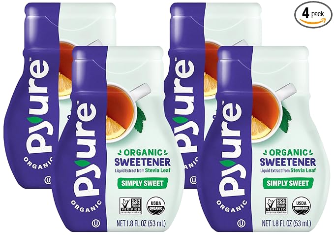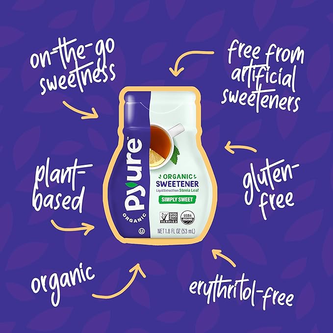 - 🏆 PYURE ORGANIC STEVIA LIQUID SWEETENER(1 BOTTLE OF 1.8 FL OZ) SIMPLY SWEET: Pyure Liquid Stevia Extract is our most convenient sugar substitute consisting of highly concentrated extract stevia. Perfect to carry in your pocket, purse or leave at your desk for on-the-go use. Pyure liquid stevia organic is super sweet so a little bit goes a long way! No bitterness or aftertaste. Mixes and dissolves well. 200 servings per container. Gently squeeze bottle to release a steady stream.