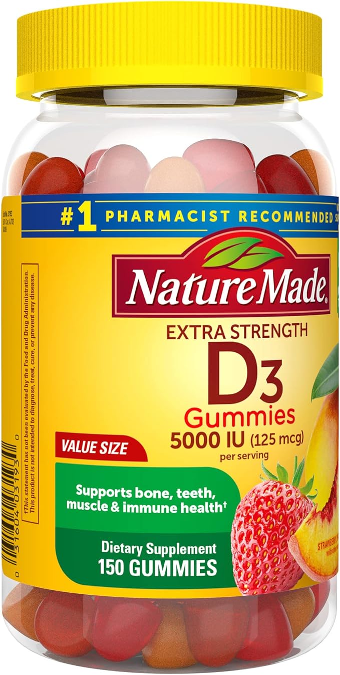 - Immune, muscle, teeth and bone health support supplement: contains one 150 count bottle of Nature Made Extra Strength Vitamin D3 5000 IU (125 mcg) per serving Gummies for a 75-day supply