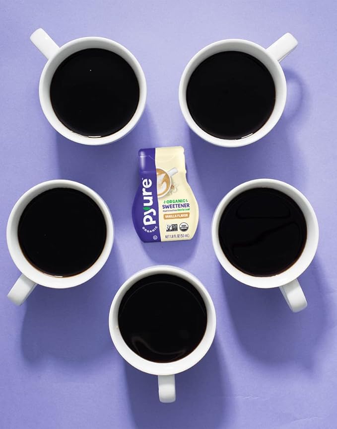 - 🏆 PYURE ORGANIC VANILLA STEVIA LIQUID SWEETENER(1 BOTTLE OF 1.8 FL OZ) : Pyure Liquid Stevia Extract is our most convenient sugar substitute consisting of highly concentrated extract stevia. Perfect to carry in your pocket, purse or leave at your desk for on-the-go use. Pyure liquid stevia organic is super sweet so a little bit goes a long way! No bitterness or aftertaste. Mixes and dissolves well. 100 servings per container. Gently squeeze bottle to release a steady stream.