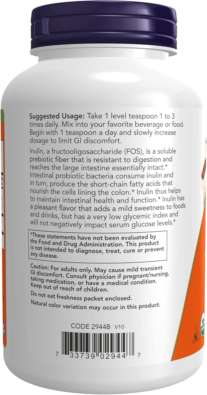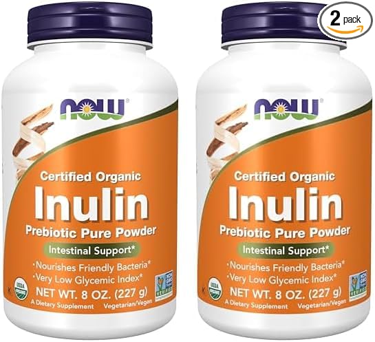NOW Supplements, Inulin Prebiotic Pure Powder, Certified Organic, Non-GMO Project Verified, Intestinal Support*, 8-Ounce (Pack of 2)