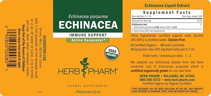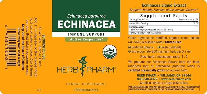 - Extracted in small batches from the certified organic root of Echinacea purpurea plants grown on Herb Pharm’s own southern Oregon farm