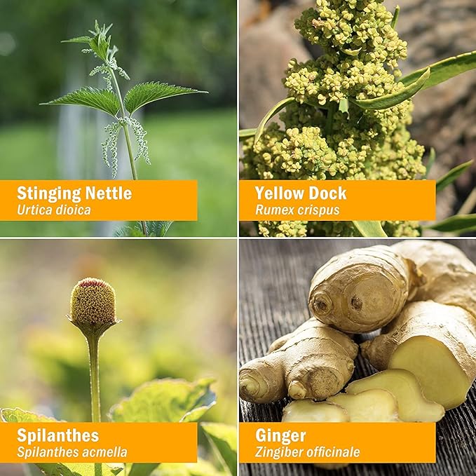 - Ingredients include Burdock seed, Ginger, Stinging Nettle, Sarsaparilla, Yellow Dock, Spilanthes, Organic Cane Alcohol, Distilled Water, Organic Vegetable Glycerin