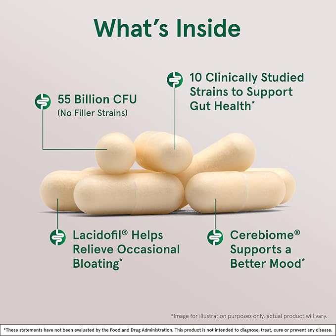 - 10 Strains of Probiotic Bacteria: Delivered via proprietary enteric coated capsules, the probiotics are protected from stomach acid and deliver the potency of friendly bacteria needed to support a healthy gut for up to adult digestive support