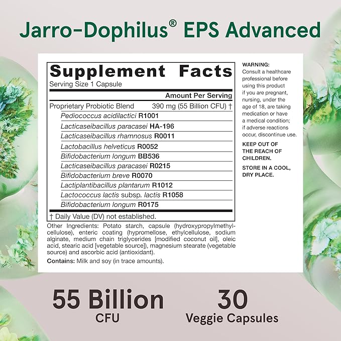 - Probiotic Supplement: One 30 count bottle of Jarrow Formulas Jarro-Dophilus EPS Advanced, provides 30 servings