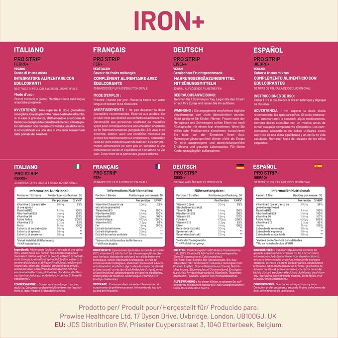 PROSTRIP® Iron+ AB-Fortis® 14mg Added with Vitamin C, B1, B2, B6, Folic Acid, Beetroot, Spinach and Tart Cherry – 30 Oral Vegan Strips – No Water Needed – High Absorption by Prowise Healthcare