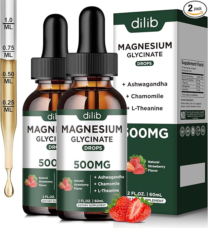 Magnesium Glycinate Supplement, Magnesium Liquid Drops with Magnesium Glycinate 500mg Ashwagandha, L - Theanine, Chamomile -Support Stress Relief, Bone, Muscle, Mood Strawberry Flavor 2Pack