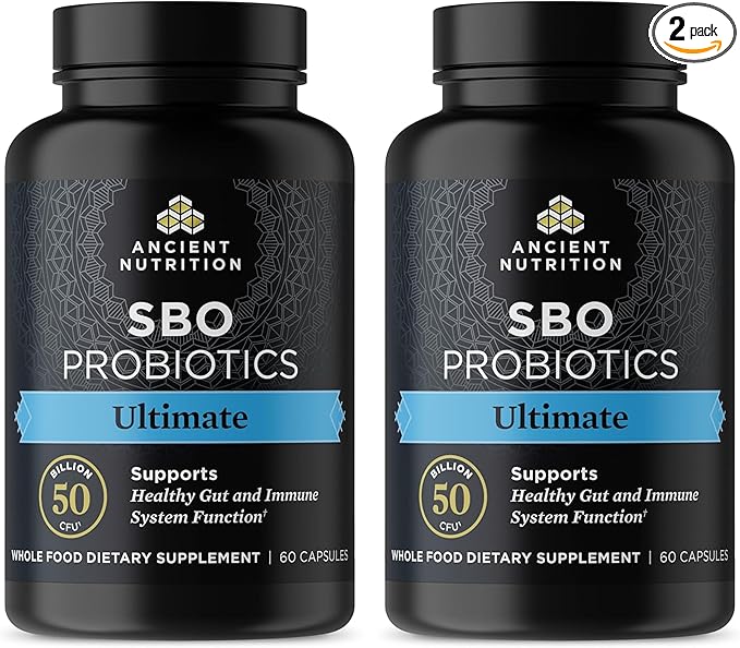 Ancient Nutrition Probiotics, SBO Probiotics Ultimate 50 Billion CFUs*/Serving, Digestive and Immune Support, Gluten Free, Ancient Superfoods Blend, Shrink-Wrapped 60 Capsules (2 Pack)