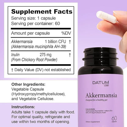 - Ingredients You Can Trust: Datum Labs Akkermansia Muciniphila is made in the USA with premium chicory inulin, a prebiotic fiber that feeds the Akkermansia probiotic, promoting a balanced gut microbiome.
