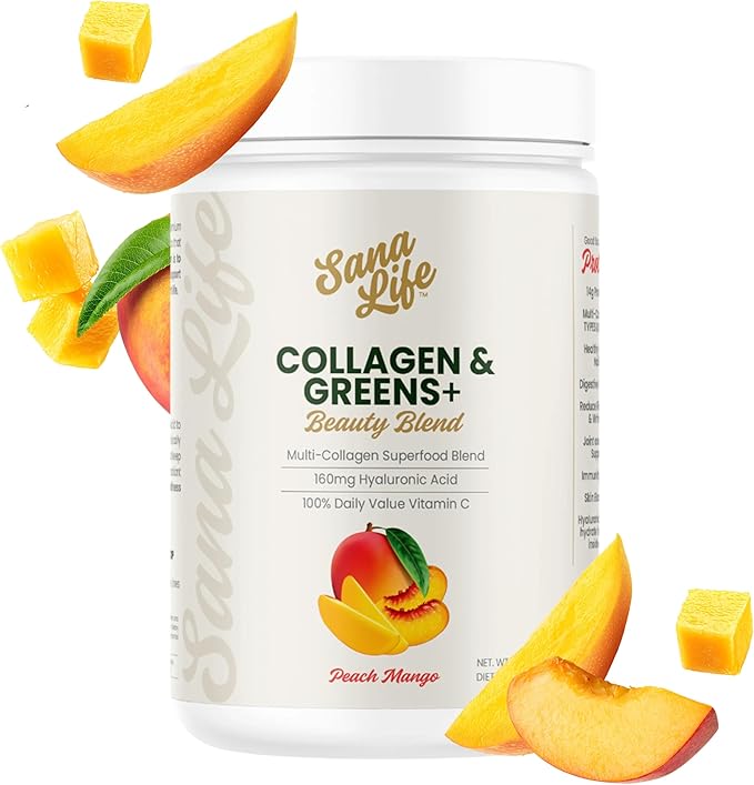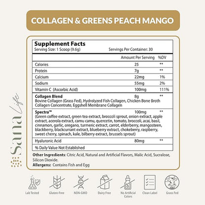 Collagen & Greens Powder, Multi-Collagen Supplement with Hyaluronic Acid for Skin, Hair, Nail & Gut Health - 30 Servings (Peach Mango)