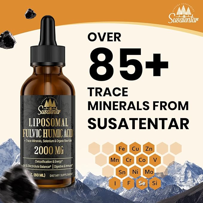 - FULVIC HUMIC ACID TRACE MINERALS: Fulvic acid generally helps with nutrient absorption. It's good for cellular wellness and permeability, has a low molecular weight, and is readily absorbed, enabling it to rapidly enter and deliver minerals into the cells. Susatentar trace mineral drops effectively with 85 + Trace Minerals for Energy and Hydration