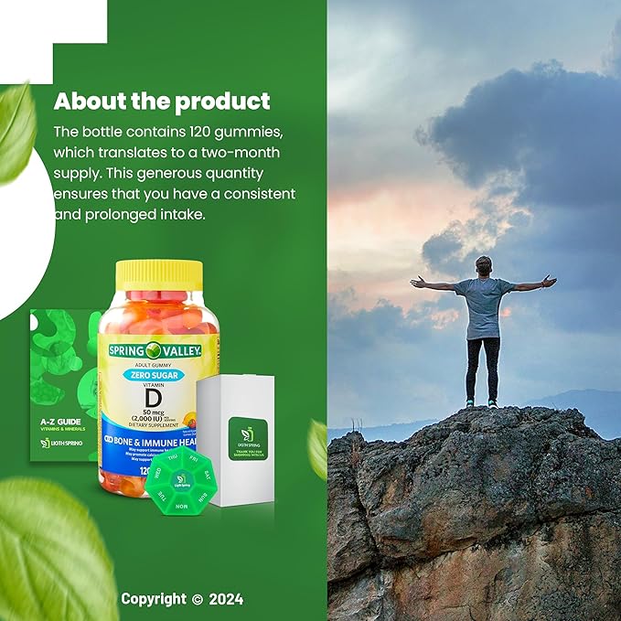 Zero Sugar Vitamin D Spring V Gummies, 50 Mcg (2,000 IU), 120 Count, Lemon, Orange & Strawberry Flavors, Supports Bone & Immune Health + Better Ligth&Spring Guide