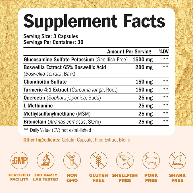 - Special Ingredients : Glucosamine, Gluten Free, GMO Free, Shellfish Free, Chondroitin
