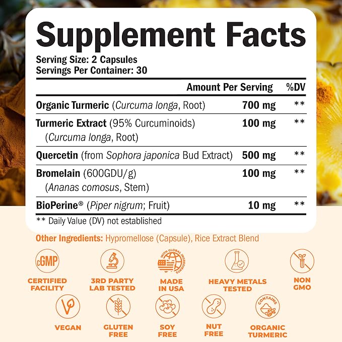 - Special Ingredients : Organic Turmeric - Provides natural joint support and promoting mobility for active lifestyles.*, Quercetin – Supports immune function and seasonal allergies, offering antioxidant support for year-round wellness.*, Turmeric Extract - Delivers concentrated curcumin benefits to combat oxidative stress and support overall immune health.*, Bromelain - Aids post-workout recovery and promotes joint flexibility by supporting muscle and joint comfort.*, Bioperine - Enhances the absorption of turmeric and other nutrients, maximizing effectiveness and overall health benefits.* Organic Turmeric - Provides natural joint support and promoting mobility for active lifestyles.*, Quercetin – Supports immune function and seasonal allergies, offering… See more