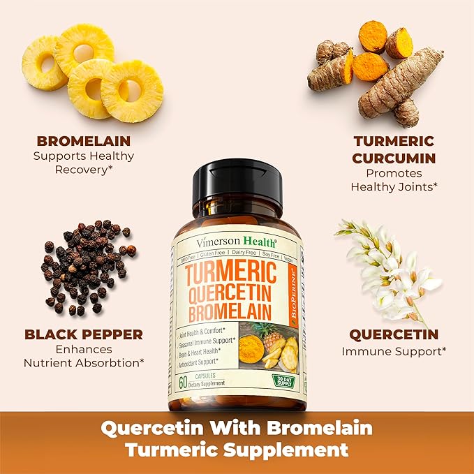 - Product Benefits : Improves nutrient absorption with black pepper extract, delivering maximum benefits in every dose.*, Supports immune function and seasonal allergies with antioxidant-rich quercetin for year-round wellness.*, Boosts immune defenses with turmeric curcumin and bromelain, protecting against harmful free radicals.*, Supports digestive health with a vegan, non-GMO formula that is gentle on the stomach.*, Enhances joint mobility and comfort naturally with turmeric, quercetin, and bromelain for daily support.*, Promotes an active lifestyle by reducing joint discomfort, perfect for outdoor and fitness enthusiasts.* Improves nutrient absorption with black pepper extract, delivering maximum benefits in every dose.*, Supports immune function and seasonal allergies with antioxidant-ri… See more