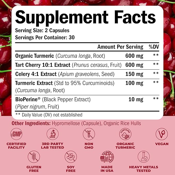 Turmeric Supplement with 10:1 Tart Cherry Extract, Turmeric Curcumin with Black Pepper & Organic Tumeric. 600mg Tart Cherry Capsules. Aids Uric Acid Balance, Joint, Muscle, Sleep Support. 2 Pack